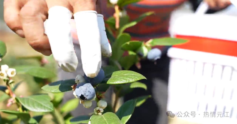 工人们提着篮子,手戴指套,穿梭在蓝莓地里,小心地将成熟的果子摘下,再轻放到篮筐里,到处一派“莓”好新气象。