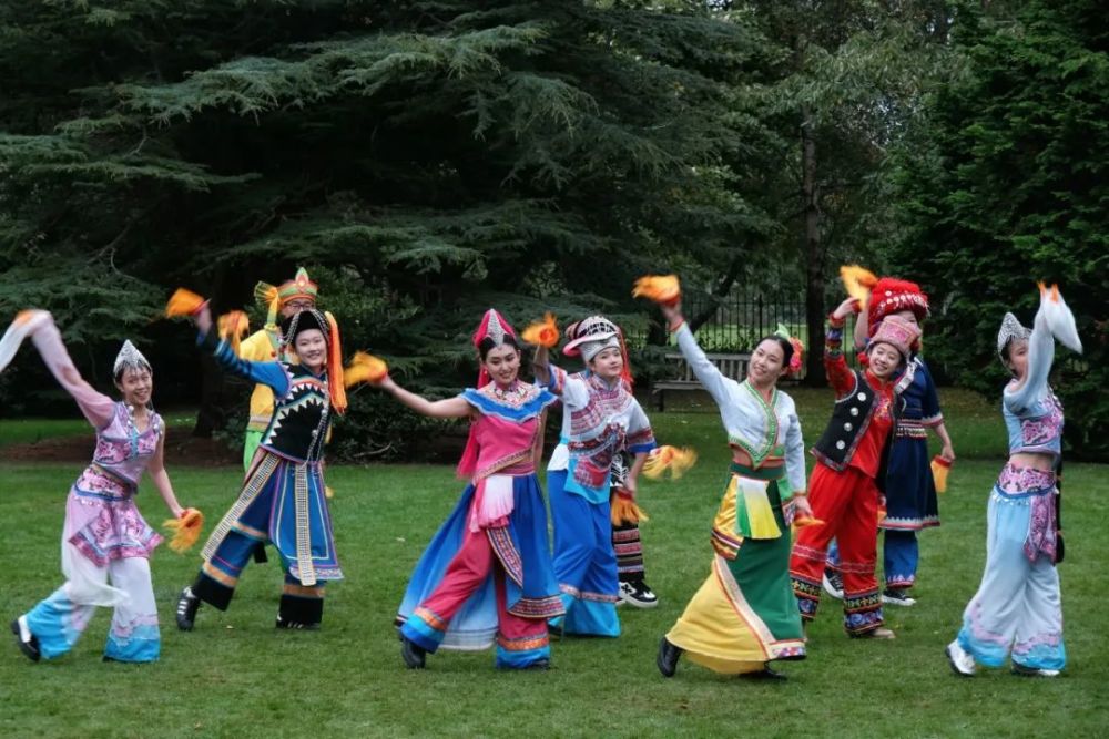 来自建水的苏格兰华人青年联合会副会长喻律贤(左四)在爱丁堡艺术节“中英传统民族文化交融”庆典中表演云南彝族烟盒舞《马缨花》
