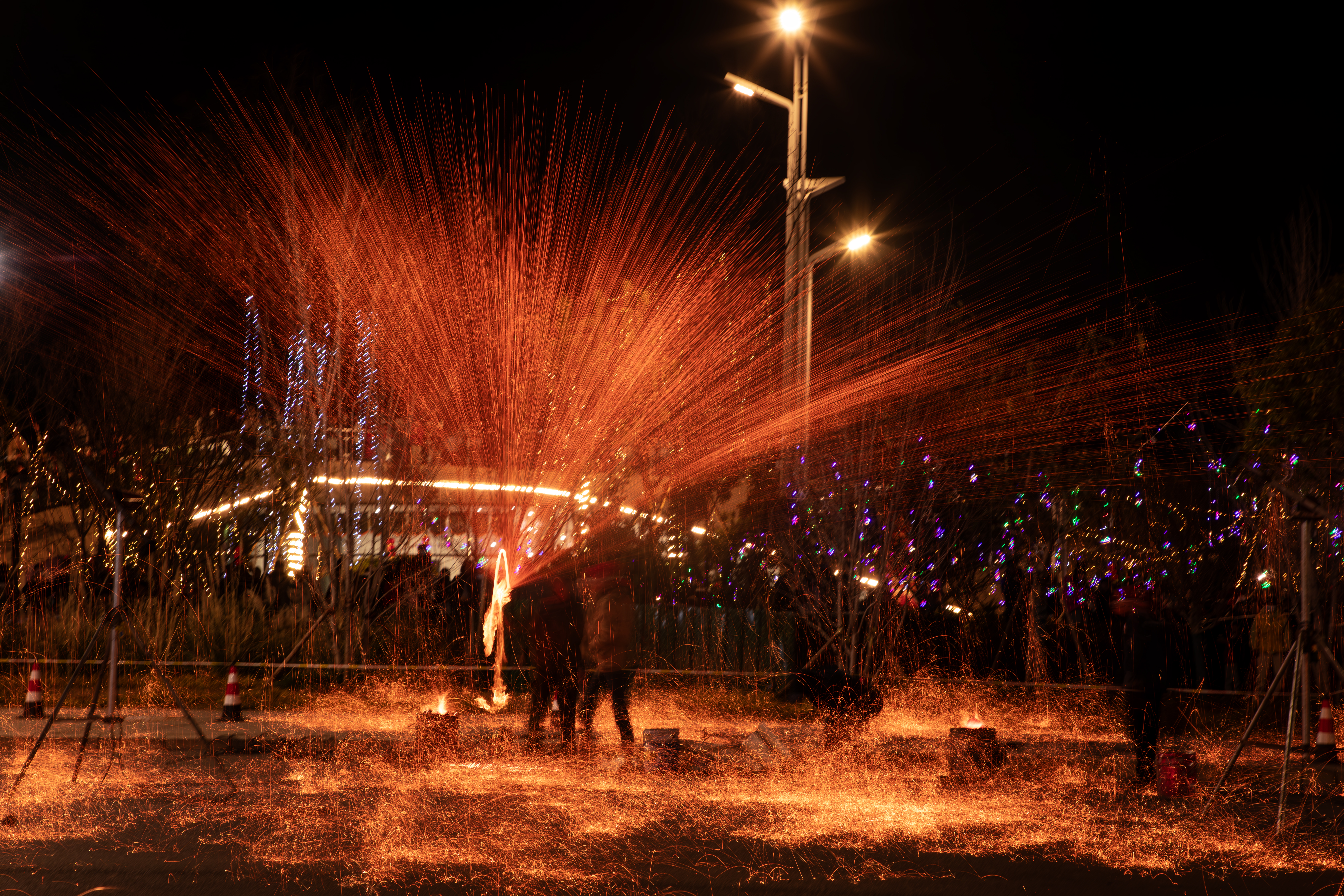 打铁花,这一古老而神奇的技艺,起源于千年前的民间祭祀活动。过去,铁匠们为了祈求来年生意兴隆、平安顺遂,在特定的节庆日,将熔化的铁水用力击向天空,铁水瞬间绽放成绚烂花火,寓意着“打花打花,越打越发”,寄托着人们对美好生活的向往。
