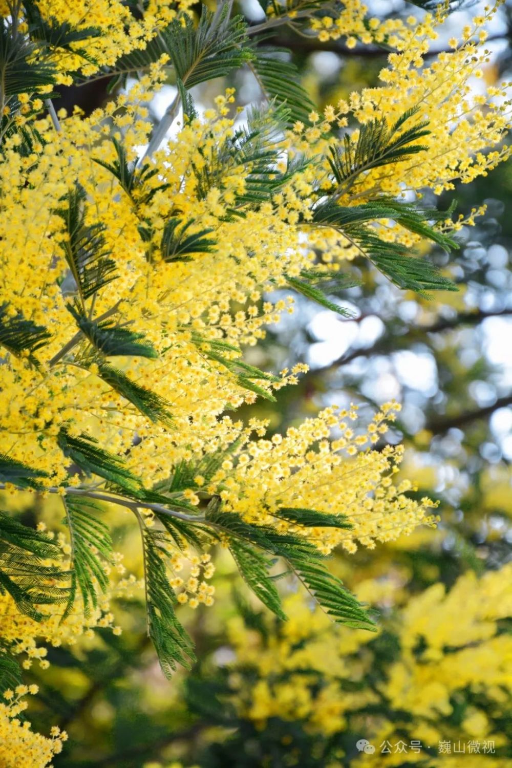 盛开的金合欢花花朵金黄无比,灿烂热烈。金合欢,学名黑荆树,别名相思树、金合欢。在阳光的映照下,半透明的质感更显灵动。花朵堆砌在树枝上,宛如一条金色瀑布倾泻而下。