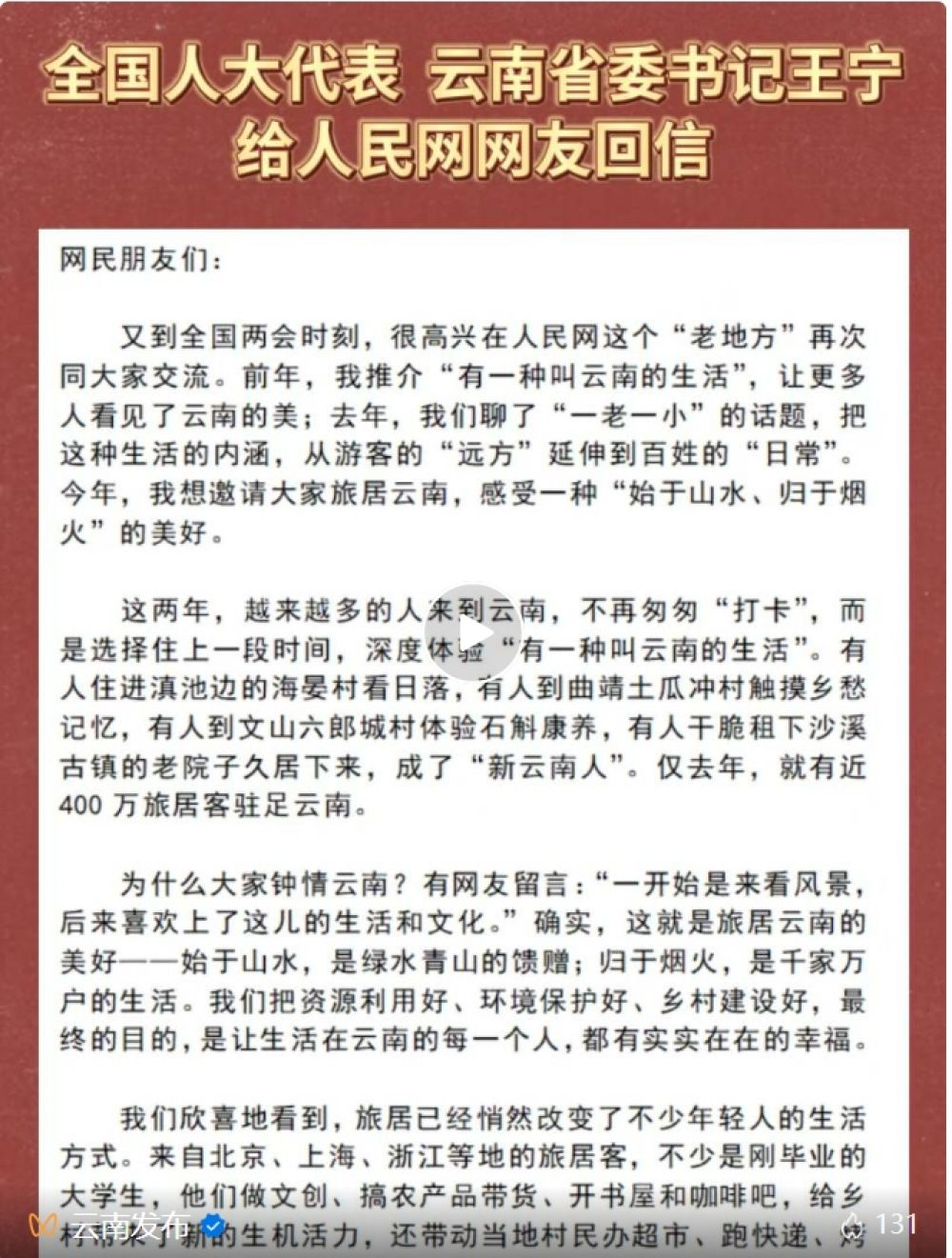 王宁说,又到全国两会时刻,很高兴在人民网这个“老地方”再次同大家交流。前年,我推介“有一种叫云南的生活”,让更多人看见了云南的美;去年,我们聊了“一老一小”的话题,把这种生活的内涵,从游客的“远方”延伸到百姓的“日常”。今年,我想邀请大家旅居云南,感受一种“始于山水、归于烟火”的美好。