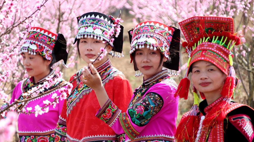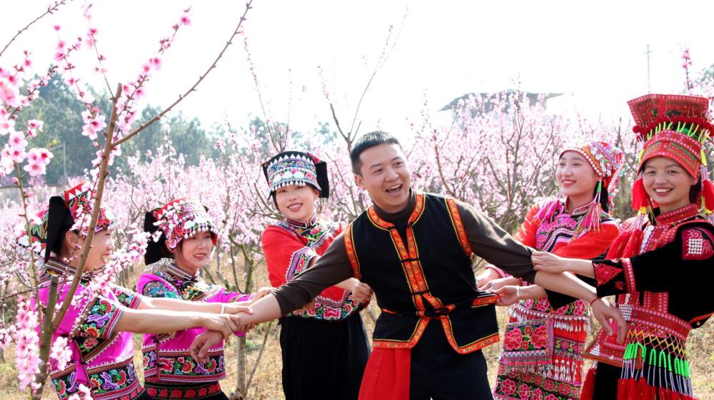 远远望去,粉墨点点,红晕层层,似彩霞飞落山间。走进桃园,漫山遍野的桃花肆意绽放,有的花瓣层层叠叠,簇拥着金黄的花蕊,热烈而奔放;有的含苞待放,花骨朵小巧玲珑,在枝头轻轻颤动。微风拂过,花枝摇曳,阵阵花香扑鼻而来,令人陶醉。在这烂漫的花海中,身着彝族盛装的游客格外引人注目,成为了花海中一道独特的风景线。大家纷纷拿出相机、手机,变换着各种姿势,与桃花合影留念,将这美好的瞬间定格。