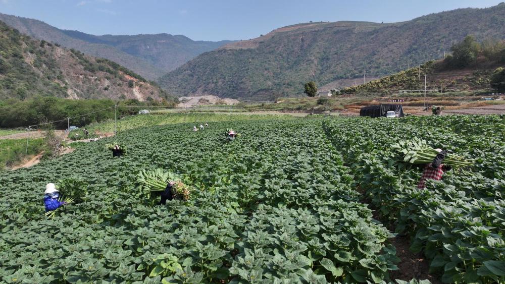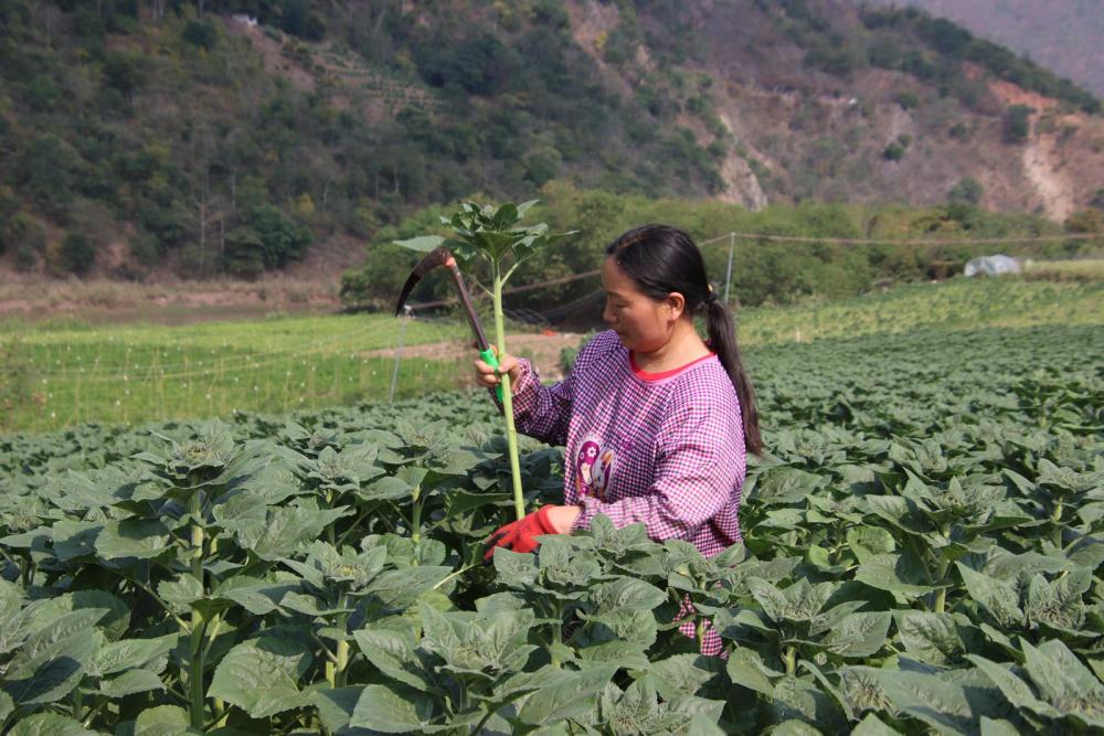 当下,正值向日葵采收期,走进曹加仙的花卉种植基地,连绵的向日葵随风翻涌,绿浪起伏间,饱满的花盘低垂颔首,20多位女工穿梭其间,动作娴熟地舞动镰刀采收即将发往昆明斗南市场的向日葵。曹加仙介绍,这一捆捆打包好的向日葵,随即将被运往昆明,通过斗南花卉交易市场销往全国各地。