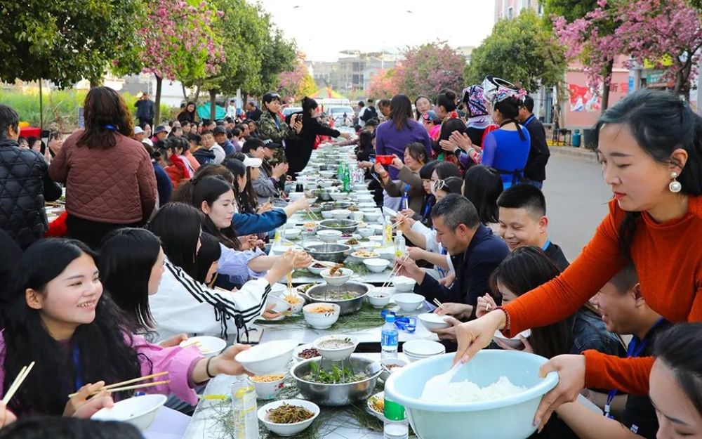 傍晚时刻,很多游客围在小吃摊前尽情享受着当地各种美食,还有很多游客参加长街宴,一起品尝美味的牛肉汤锅。