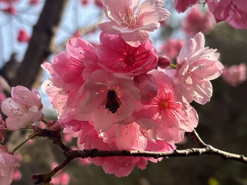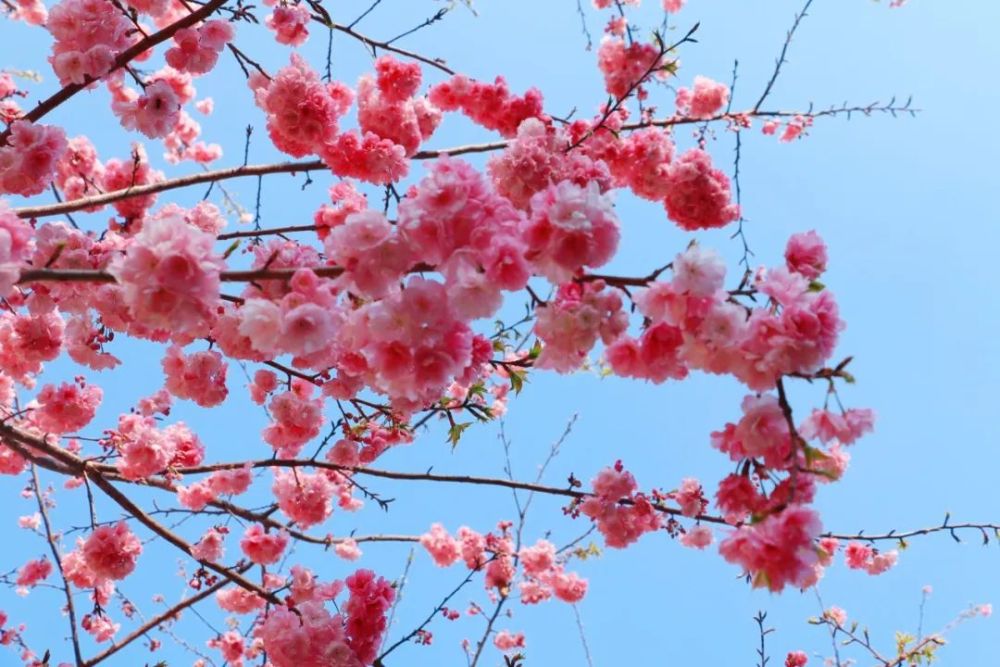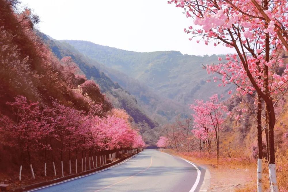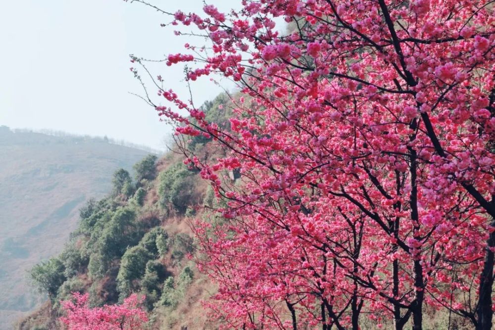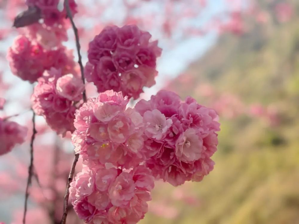 从远处看,樱花树在蓝天白云的映衬下亭亭玉立,泛着娇嫩的粉红色光泽,与远处磅礴的大山相互交织。一个豪迈壮阔,一个婉约柔美,勾勒出一幅刚柔并济、美不胜收的画卷。