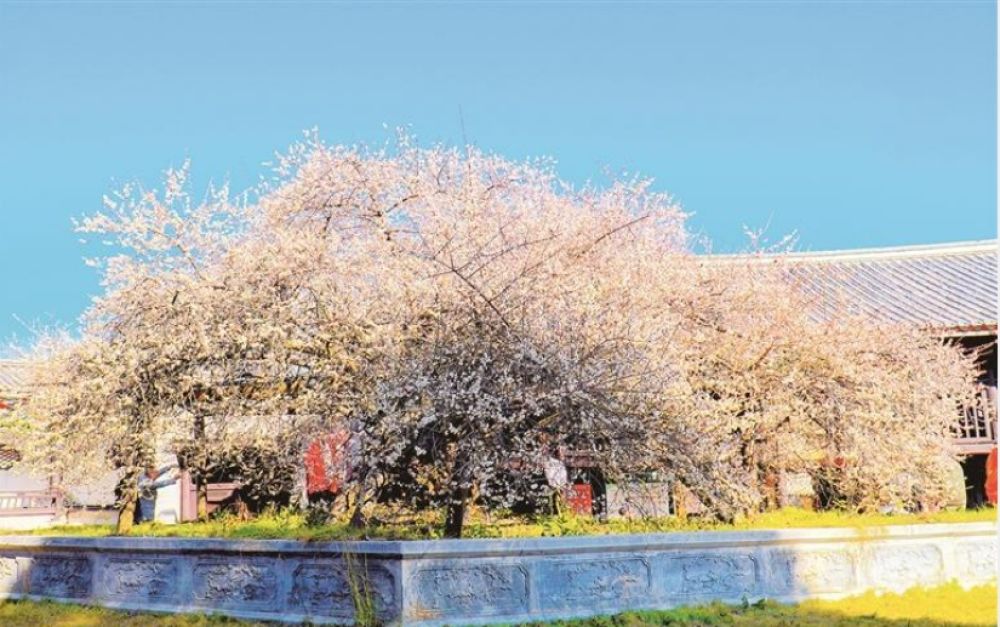 花桥,因一棵古道元梅而出彩。“阅历风霜,问尔几生修到此?传来锦绣,有谁千载艳如斯?”诗人窦居炎笔下,元梅韵胜格高,是天地之精灵。“普照寺建于元……庭前有元梅一株,猗曲苍劲,遍生藓苔,每当岁首,花枝盛开,花皆重瓣,实则对生。”《永平县志稿》里,树龄近800年的古道元梅张合四方,是自然之尤物。