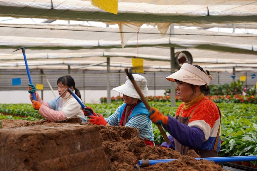 在云南赋美农业有限公司大棚内,工人们手法娴熟、有条不紊地进行着松土、换盆与打包工作。一盆盆红掌争相绽放,洋溢着蓬勃生机。陆良地处滇东高原,光照充足,气候温和,为花卉生长提供了天然温床。