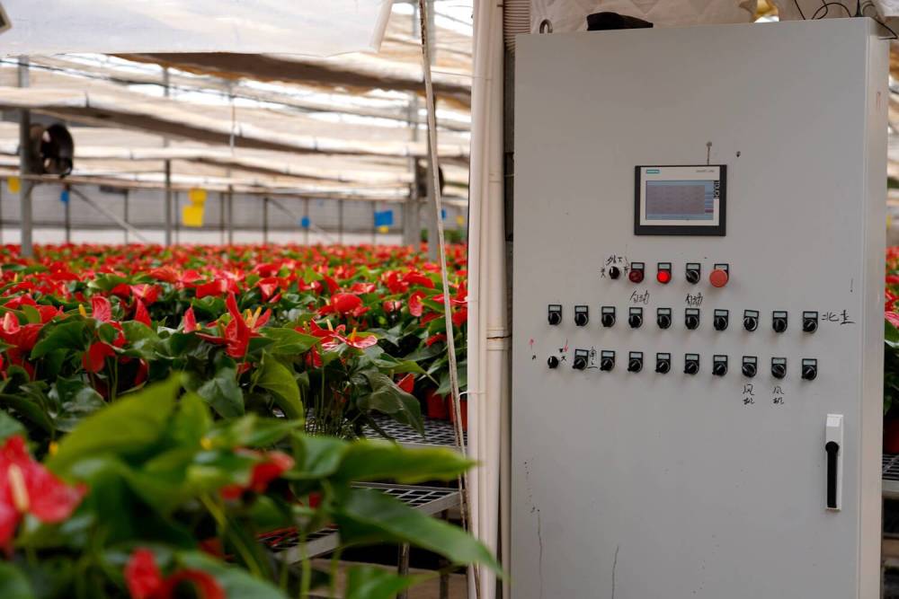 与传统花匠埋头锄草施肥不同的是,技术员每天的工作是穿梭于各个温室大棚之间,查看设备运行状况,关注鲜花的生长态势。“这是我们的一个操作电箱,里面有相对应的一些设备,利用这个温度探头探测到棚内的实际温度,如果温度超高或者是降低,它会对应调节风机或者是加温设施,来达到红掌的正常需求的温度。”邹继均介绍道。