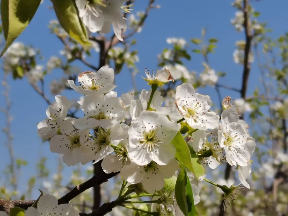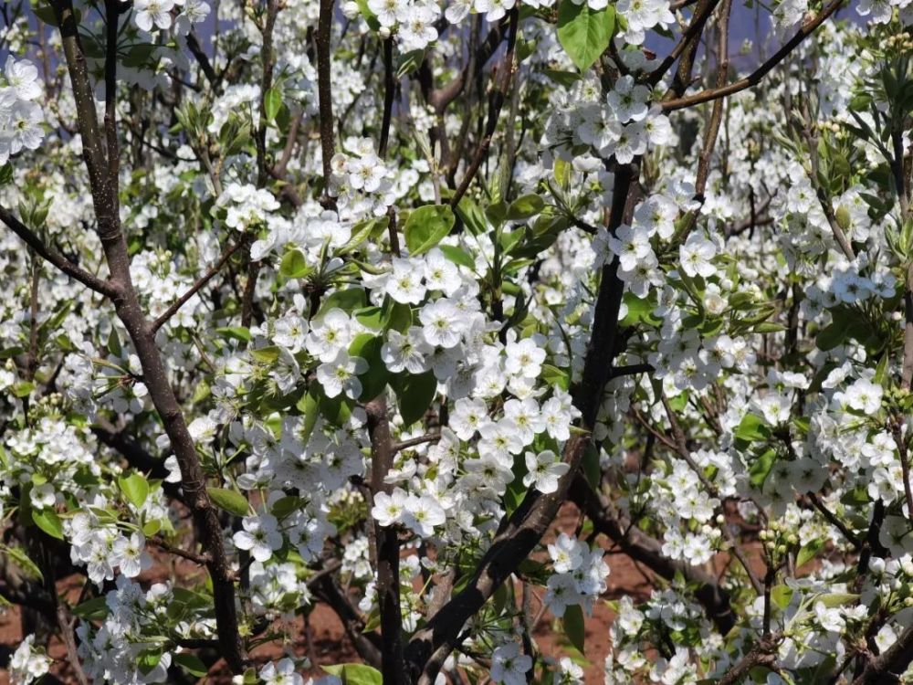 走进培元老麻地村的百亩连片梨园,满园的梨花扑面而来,充斥着炫目的白光,满园春色,一片洁白。枝头上,娇艳的梨花,一丛丛、一树树,花团锦簇。晶莹、雪白耀眼的梨花,别样雅致。有的正鼓出花苞,绿茸茸的花萼托着洁白娇嫩的花蕾,花团圆硕。有的已经完全绽放,洁白、光鲜的花瓣围绕着绿白娇嫩的花蕊,密密麻麻的一片,从枝头到枝底,一串洁白,在初春的阳光下,细密洁白的花瓣,千朵万朵,白清如雪,洁如缟素,显现出春的生机与生命的美丽。淡淡的花香,沁人心脾。