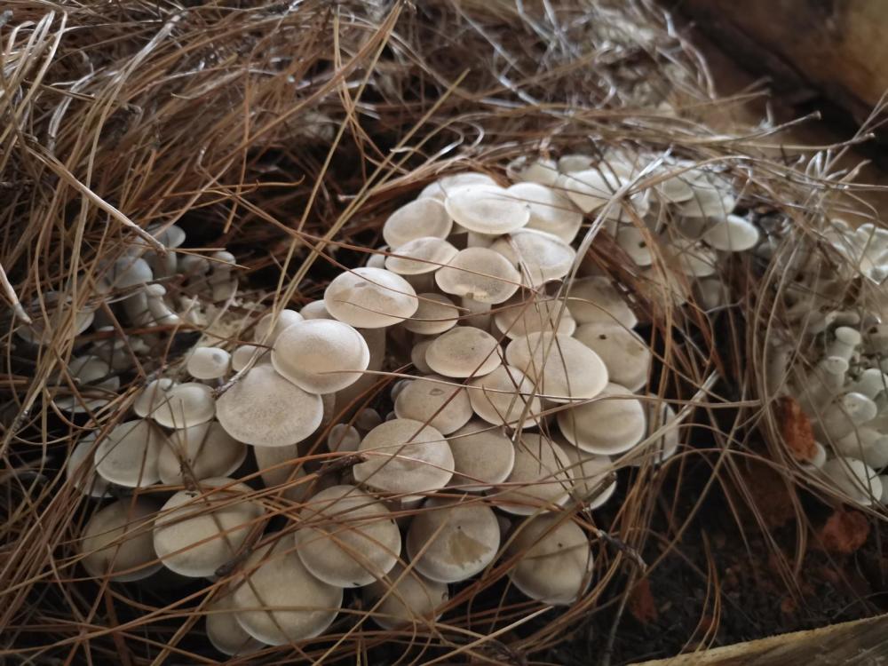 走进云龙村八组的闲置公房,只见一簇簇灰白的鹿茸菇破土而出,菌群密集生长、长势喜人。村组干部正细心清理覆盖在菌棒上的松毛,沿着根部小心翼翼地采摘鹿茸菇,现场一派繁忙的丰收景象。