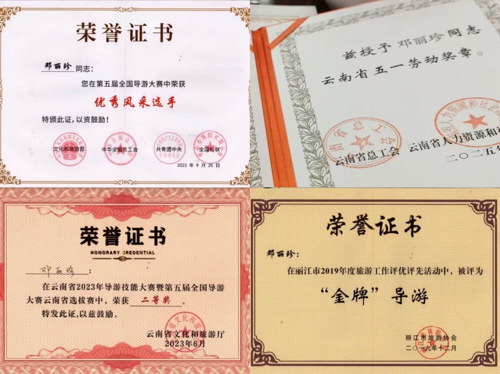 邓丽珍是一名来自湖南省的90后导游,2019年6月开始正式带团。从事导游工作以来,接待了近万人,至今仍保持着零投诉零差评的佳绩,也成为各大旅行社首发团、特殊团的指定导游。一分耕耘一分收获,2019年、2025年她获得“丽江市金牌导游”称号;2019年、2021年获得“云南省优秀导游”称号;2023年6月荣获第五届全国导游大赛云南选拔赛第二名;2024年10月参加云南省职业技能大赛,荣获铜奖,被授予“技术能手”称号;2025年5月荣获云南省五一劳动奖章。