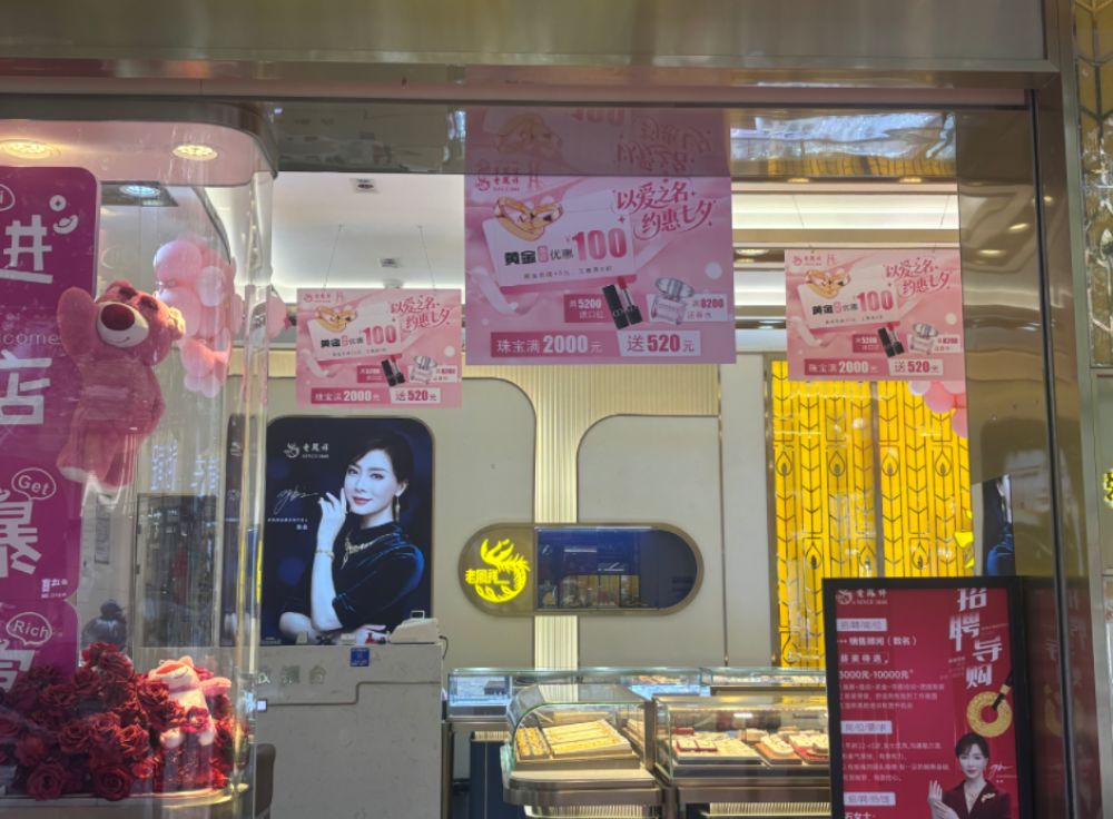 在南屏街商业中心,这里的七夕氛围更为浓厚,各大品牌门店纷纷换上七夕主题装饰,粉色气球、爱心挂件、鹊桥布景随处可见,化妆品、珠宝首饰等区域成为市民拍照打卡的热门地点。商家们也抓住节日契机,推出七夕限定礼盒和折扣活动,其中黄金珠宝店的表现尤为亮眼。每克黄金最高优惠90元、黄金钻戒可享7.7折、购买珠宝满2000元获赠520元抵用券等优惠活动十分可观。即便是工作日,周大福、周六福、周大生、中国黄金等知名品牌门店内,前去选购的顾客依旧络绎不绝,店员们热情地向顾客介绍新款产品和优惠活动。