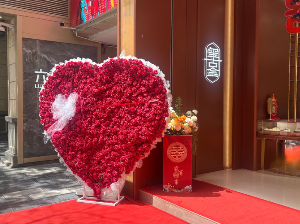 品牌门店内粉色气球、爱心挂件、鹊桥布景随处可见