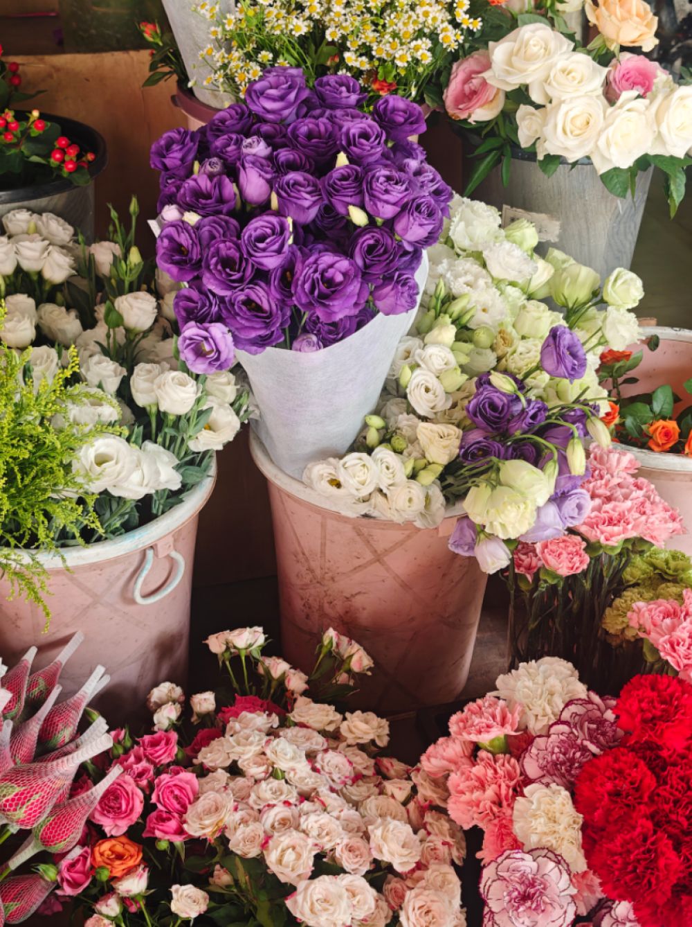 中午时分,在昆明南亚商圈附近,多家花店早已进入忙碌模式。走进西山区野觅花店,各色鲜切花错落摆放,热烈的红玫瑰、娇羞的粉玫瑰、梦幻的碎冰蓝玫瑰、复古的卡布奇诺玫瑰,每一朵都散发着沁人的芬芳。店员们穿梭在花丛中,修剪枝叶、搭配花束,为即将到来的订单高峰做足准备。