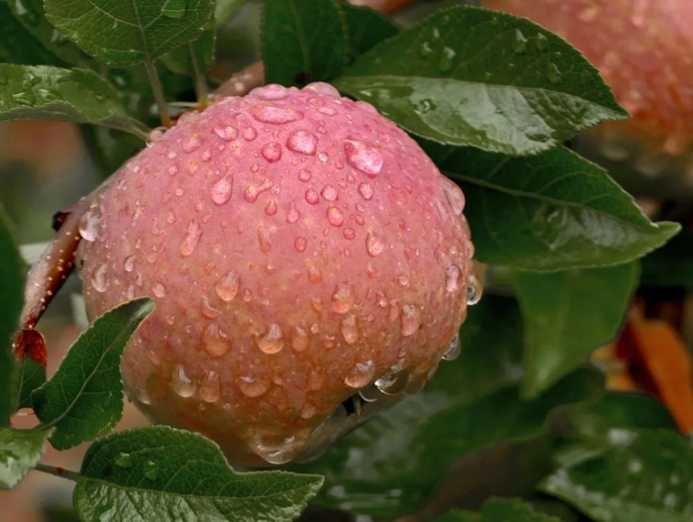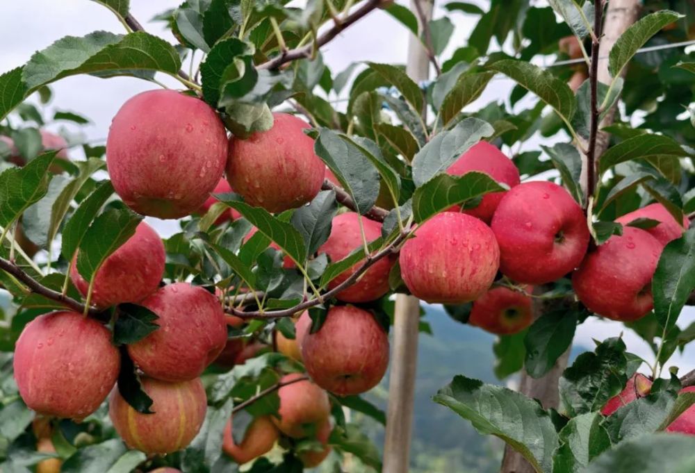 渐红的苹果沾着八月的雨水。(丽江融媒记者 廖浚宏 摄)