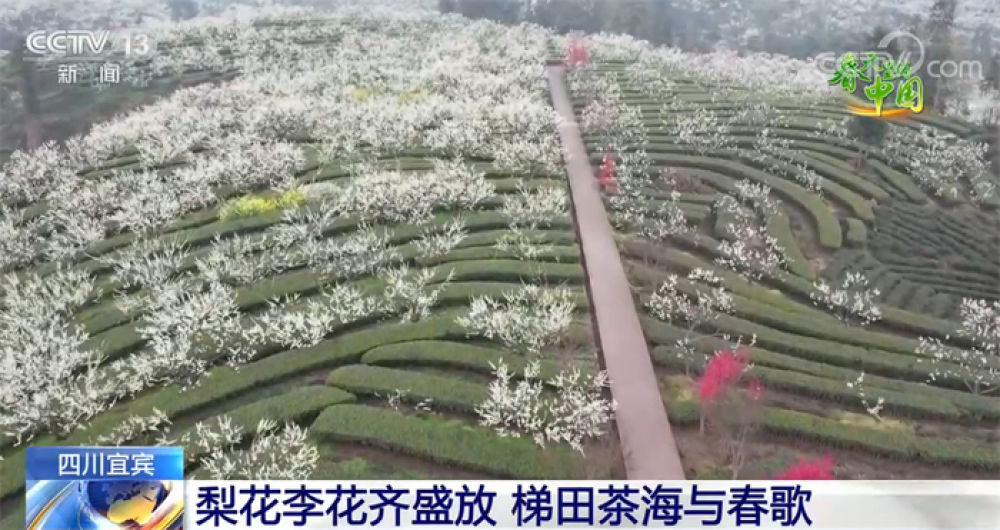 现在我们来到四川宜宾锦屏镇,一树树梨花、李花竞相绽放,将锦屏山装扮一新。放眼望去,一片淡雅纯净的白色花海,树下一行行茶垄郁郁葱葱,仿佛绿色的五线谱,盛放的梨花、李花好似五线谱上跳跃的音符,奏出春天的乐章。游客走进梯田茶海,置身梨花、李花之下,散步踏青,尽享春日美好时光。