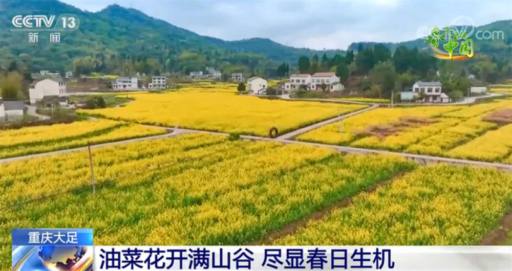 现在,我们来到重庆市大足区回龙镇,从空中俯瞰,油菜花为大地披上金灿灿的春装。青山绿树之间,油菜花海顺着山谷蜿蜒伸展,春风拂过,油菜花轻轻摇曳,尽显春日生机。远远望去,阡陌纵横的田野与远处的村庄相互映衬,构成一幅田园风景画。