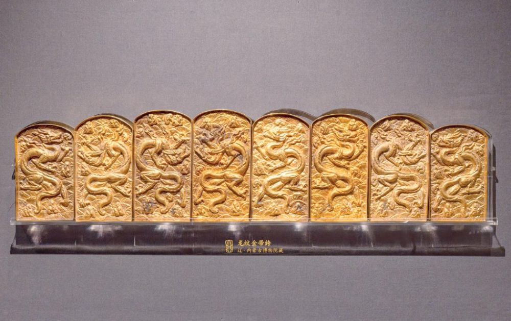 “这组金带銙出土时呈‘山’字形排列,八块金銙,四块升龙腾空而起,四块降龙俯冲而下,龙鳞层层叠叠,与四周云水纹相映生辉,极具张力。”郑承燕在介绍时语气中难掩激动,“龙是我们中华民族的图腾,龙纹出现在契丹政权的服饰中,侧面反映了契丹政权中原传统文化的高度认可,更将其内化为自身身份与权力的象征。”