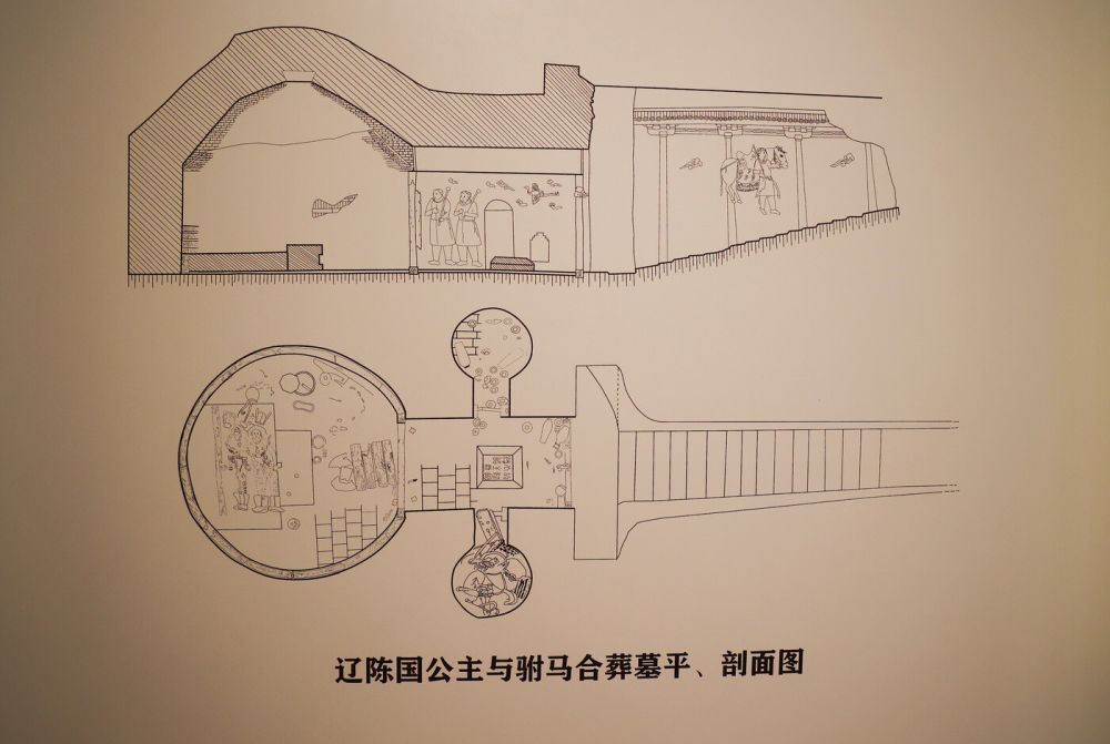 内蒙古博物院内展示的辽陈国公主与驸马合葬墓平、剖图。内蒙古日报·草原云记者 钦柏 摄