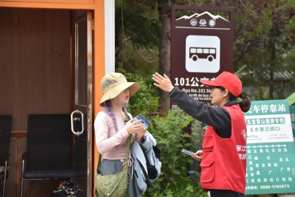 玉龙雪山志愿者正为游客指引路线。(图片来源:丽江融媒)
