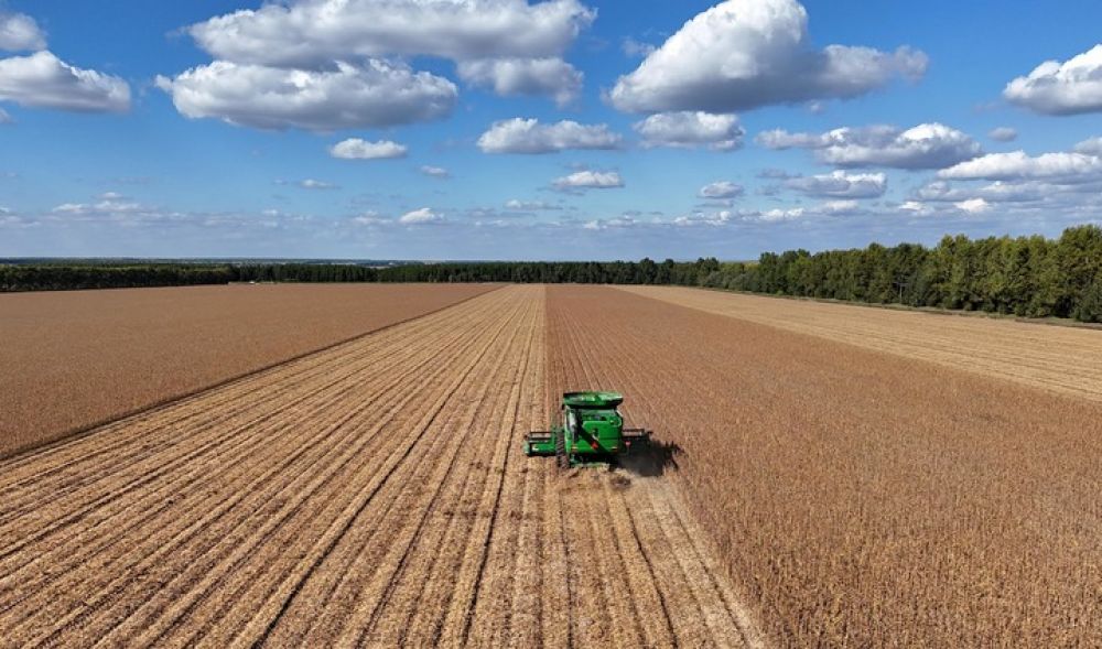 2025年9月19日,在北大荒集团黑龙江格球山农场有限公司大豆地块,收获机车在进行收获作业(无人机照片)。新华社发(陆文祥摄)