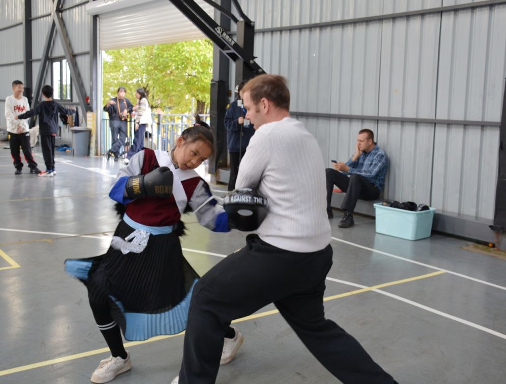 外教老师指导女同学拳击。(丽江融媒记者 吕坤钊 摄)