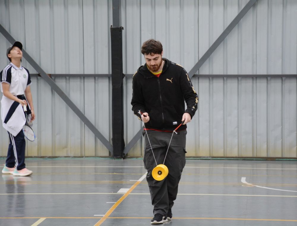 外教老师表演抖空竹。(丽江融媒记者 吕坤钊 摄)