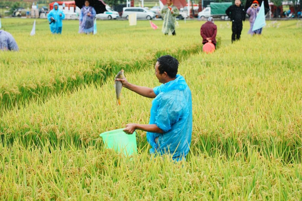 开幕式结束后,进入抓稻田鱼环节。大家挽起裤脚,深入金黄的稻田间,弯腰俯身,目光专注地搜寻着水下的肥鱼。每当有鱼影闪过,双手便迅速探入水中捕捉。不一会,一条条肥美的稻田鱼被陆续装入水桶。现场欢呼声、欢笑声此起彼伏,与稻香、泥土的气息交融在一起,构成了一幅生动的丰收图景。