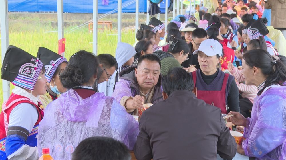 与往届相比,今年的“稻花节”新增了极具民族特色的长街宴。餐桌摆放在稻田边,桌上摆满了九河乡的特色美食,宾客品尝着地道风味,畅谈丰收喜悦。天地为幕、稻田为景的盛宴,不仅满足了味蕾,也是一场沉浸式的田园体验。