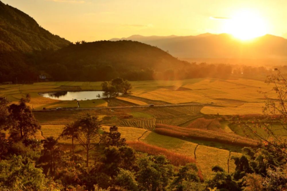 菠萝村的梯田在九月披上“渐变色外衣”——稻谷由青转黄,层层叠叠如大地的调色盘。清晨薄雾弥漫时,光影洒落田间,是摄影爱好者不可错过的天堂。