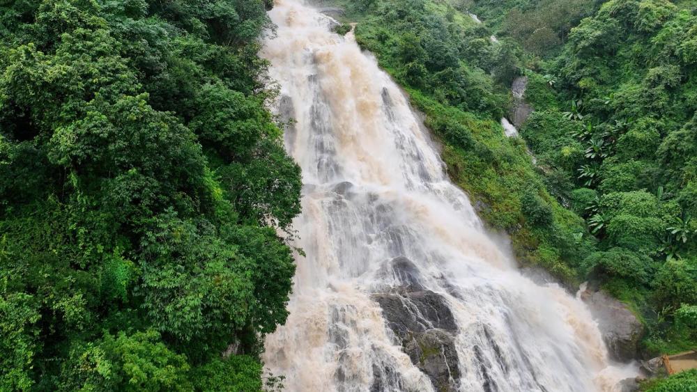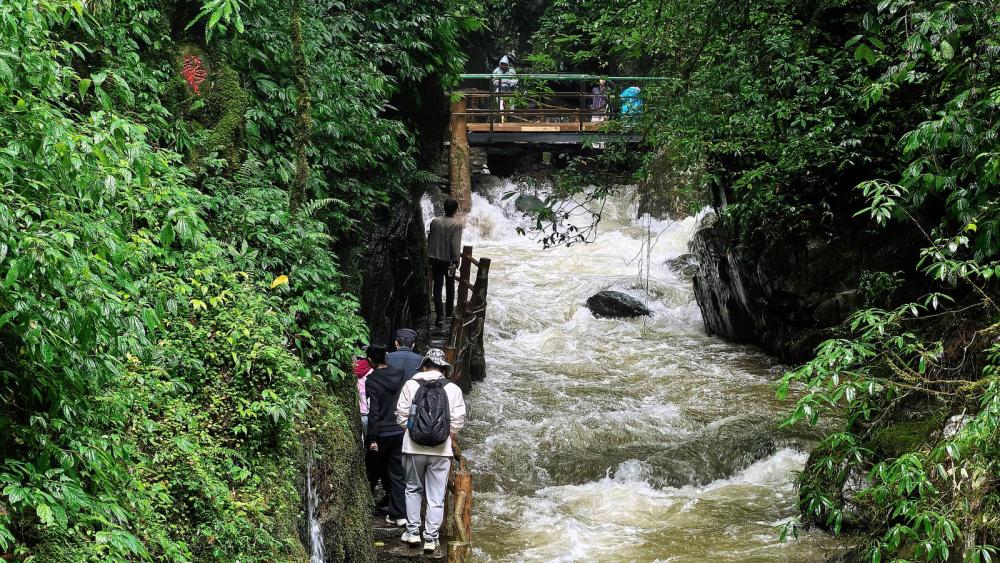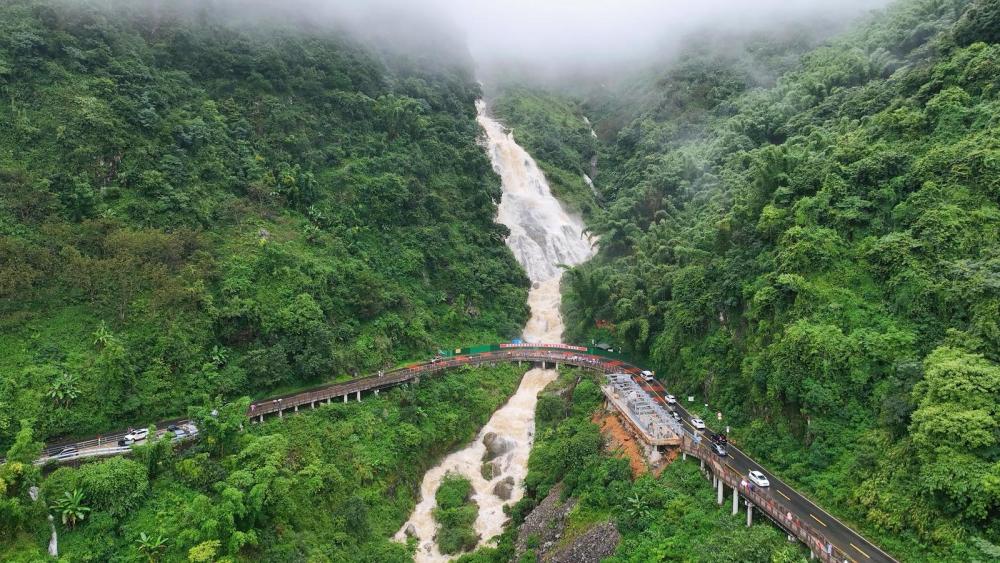 秋日哀牢山,细雨如丝,林木苍翠欲滴。沿红河谷自驾线路蜿蜒而上,未见其形,先闻其声,南恩瀑布的轰鸣已响彻山谷。连日雨水让此刻的瀑布尽显狂野,水流如万马奔腾,从崖壁倾泻而下,猛烈撞击岩石,激起千堆雪浪,声如雷鸣。雨丝与水雾交织弥漫,为这磅礴景象更添几分朦胧诗意。游客们或撑伞举镜,或驻足仰望,沉浸于这自然的伟力与壮美之中。