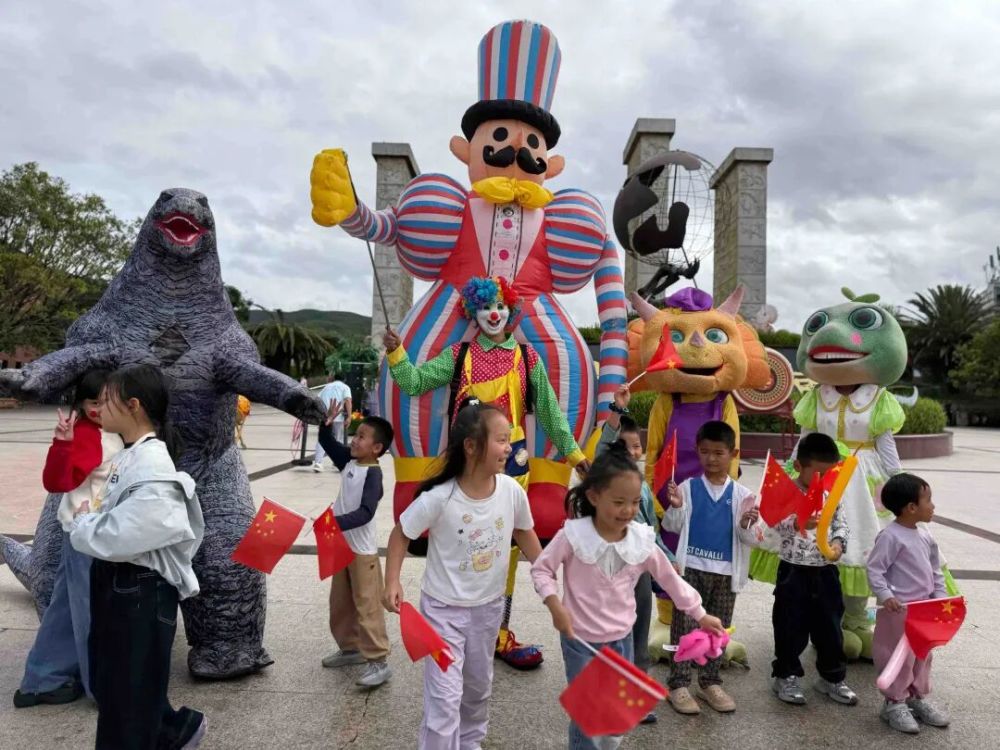 国庆中秋假期,禄丰世界恐龙谷景区举办国潮文化节。在景区迎宾广场,禄丰龙、霸王龙等充气模型列队排开,欢迎八方来客,鼓舞秀、红歌快闪等活动轮番上演。游客们纷纷在景区主入口处的爱国主义打卡装置“鼓舞中国红”前敲响大鼓、拍照留影。
