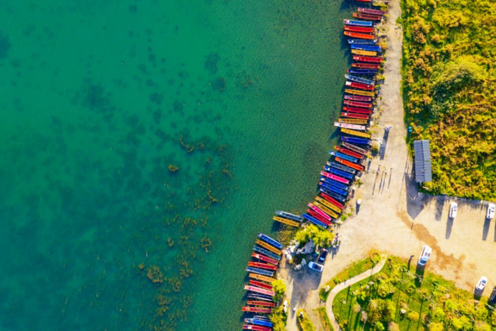 从空中俯瞰,泸沽湖如一块巨大的蓝宝石镶嵌于群山之中,而湖岸边的花海则似为它精心绣上的彩边。村落炊烟袅袅,猪槽船轻划水面,勾勒出人与自然和谐共生的诗意画卷。