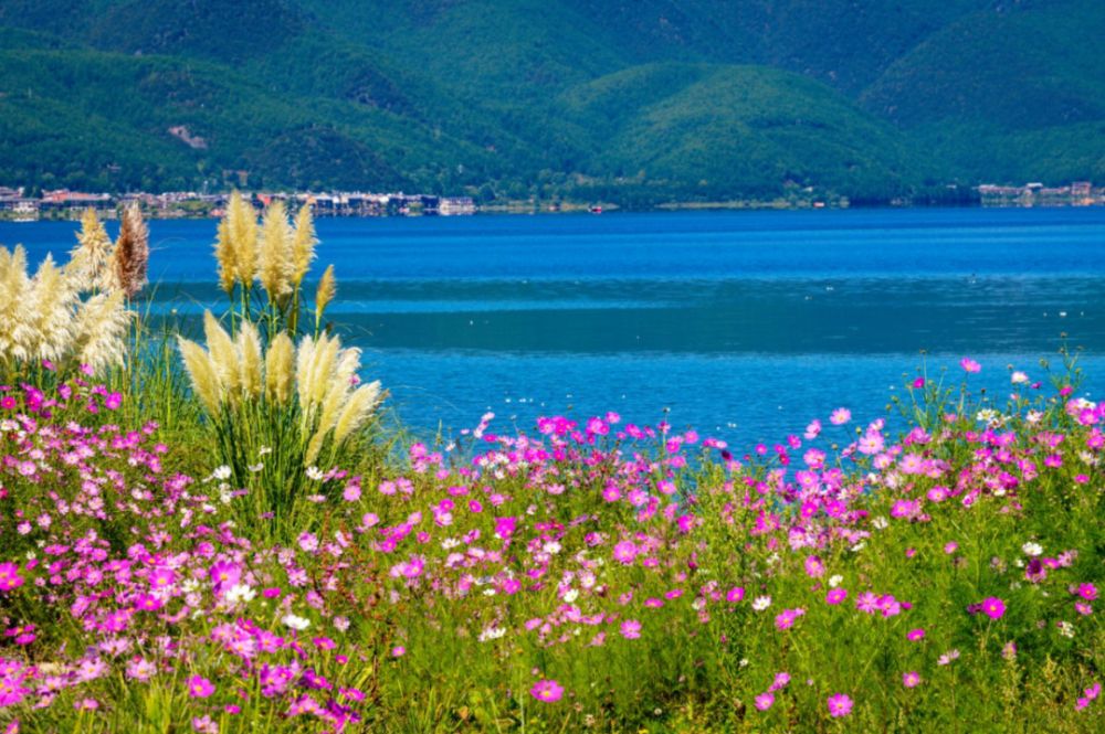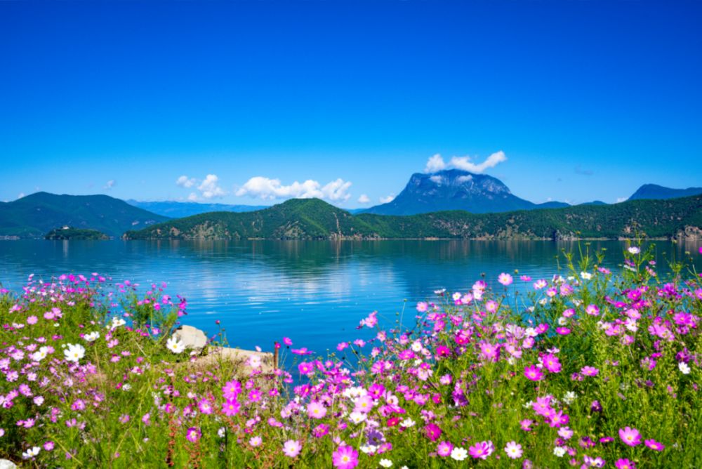 在云南省丽江市宁蒗彝族自治县泸沽湖畔,成片的格桑花迎风绽放,粉的娇柔、白的清雅、紫的静谧,如彩带般铺展在湛蓝湖水与苍翠群山之间,将这片秘境装点成童话世界。