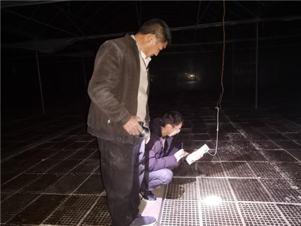 巨甸烟站人员雪天查看苗棚温度。(和江龙/摄)