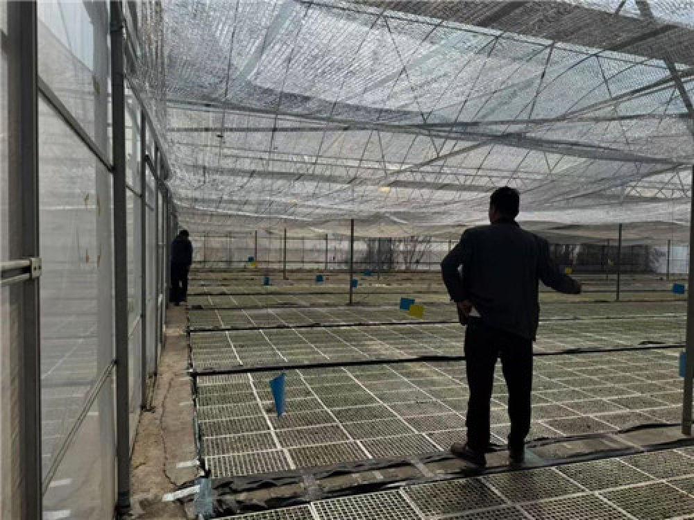 在育苗棚挂置黄蓝板。(向帆/摄)
