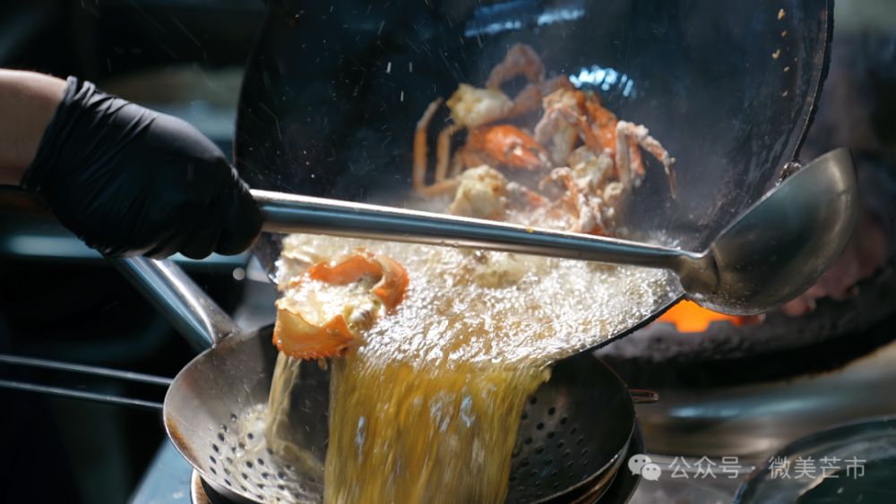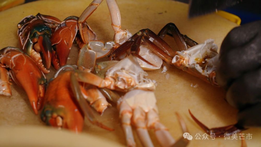 厨师们将刚清洗好的新鲜缅甸青蟹对半切开,入锅与各类调料爆炒,香气瞬间弥漫整条街道。这口从印度洋“远道而来”的鲜味与当地的傣味爆炒碰撞出奇妙的味蕾体验,成为芒市这座中缅边境小城的特色美食之一。