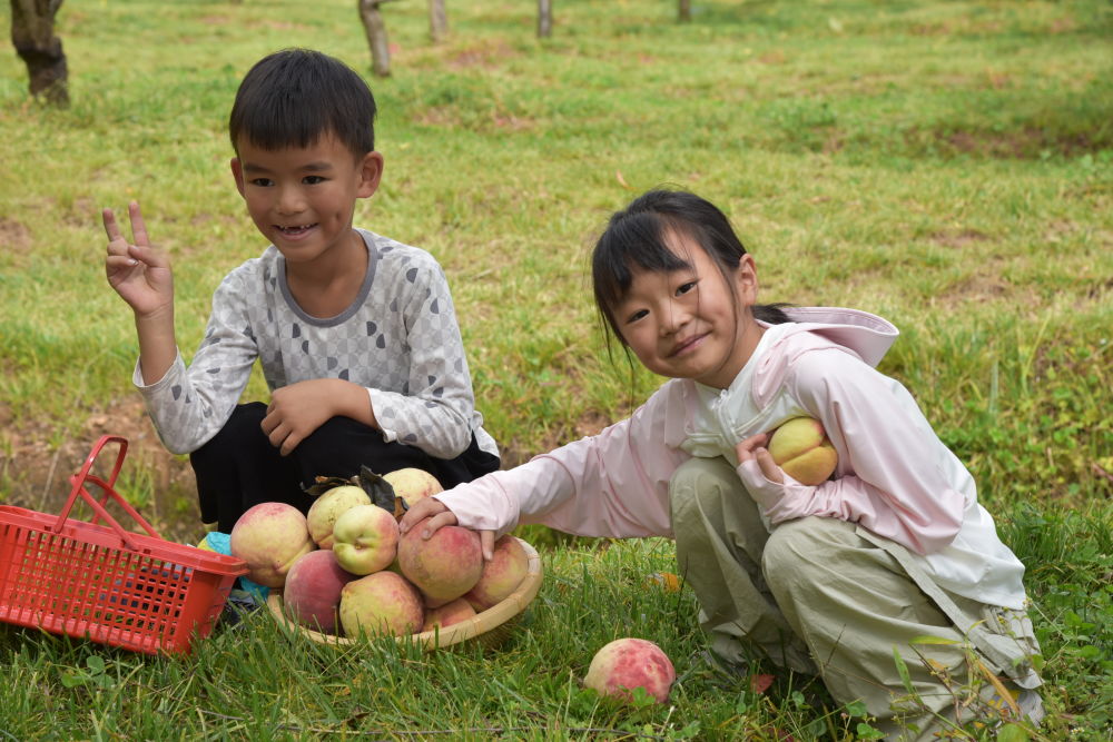 孩子们到丽江美鲁纳西村景区的高原农业生产观光区采摘雪桃。(丽江融媒记者 段玉菊 摄)