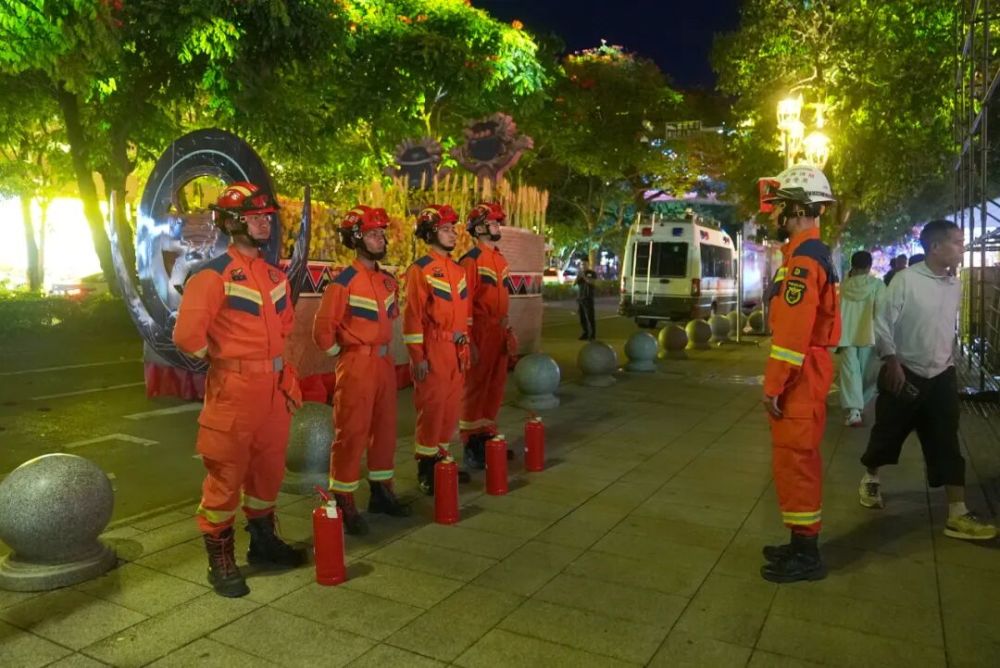 而在县城另一头的消防执勤点,消防队员陶劲舟与队友的防火巡查路线像一张无形的网,串联起县城所有活动节点。陶劲舟与队友穿梭在沿街集市的人群中,向市民宣传消防知识,快步巡视篝火晚会区,醒目的橙色身影穿过人潮,在消防执勤点与队友交接值守。而他们巡视的目光,穿过络绎不绝的人潮,始终锁定在佤族新米节主会场的方向——这是守护安全的最短距离。