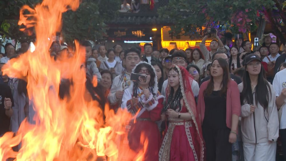 在丽江古城景区四方街,游客参与篝火打跳。(丽江融媒记者 木雯娇 摄)