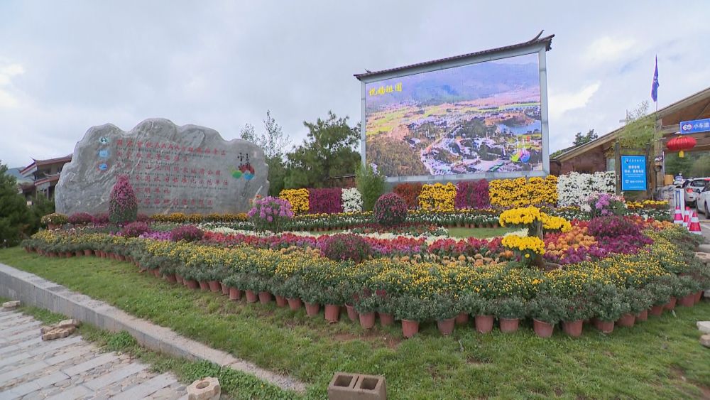 丽江古城景区,游客纷纷与菊花盆景合影。(丽江融媒记者 木雯娇 摄)