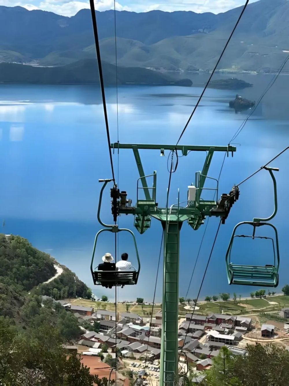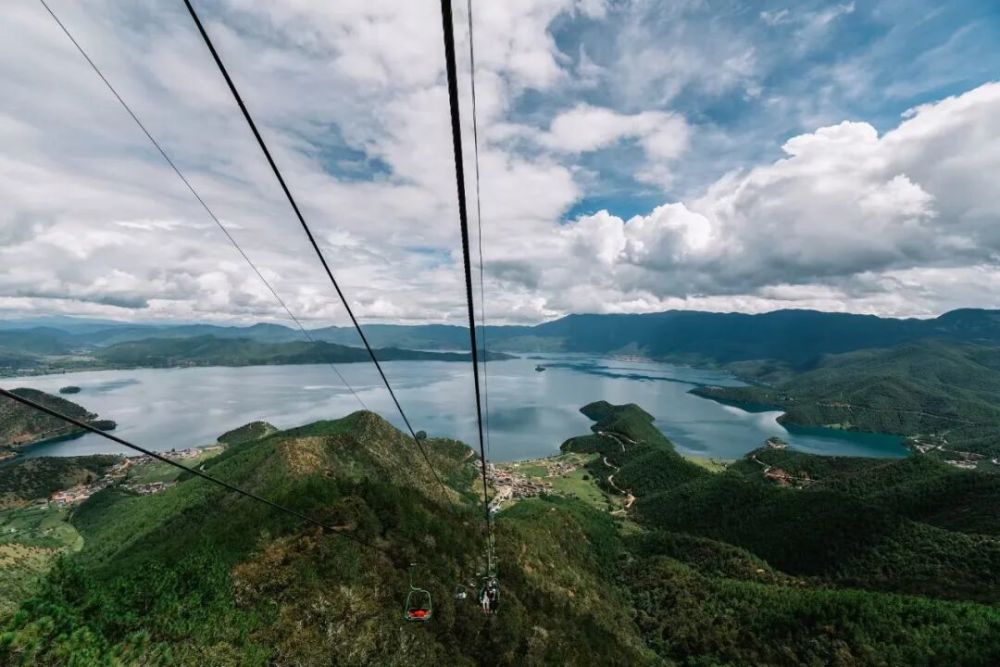 换个视角瞰湖光山色,解锁“云端瞰湖”的全新视角。坐上索道可以在高空俯瞰泸沽湖的碧蓝湖面,湖水随光线变化呈现出浅蓝、深蓝、墨绿等多种色彩,也是别有一番意境。