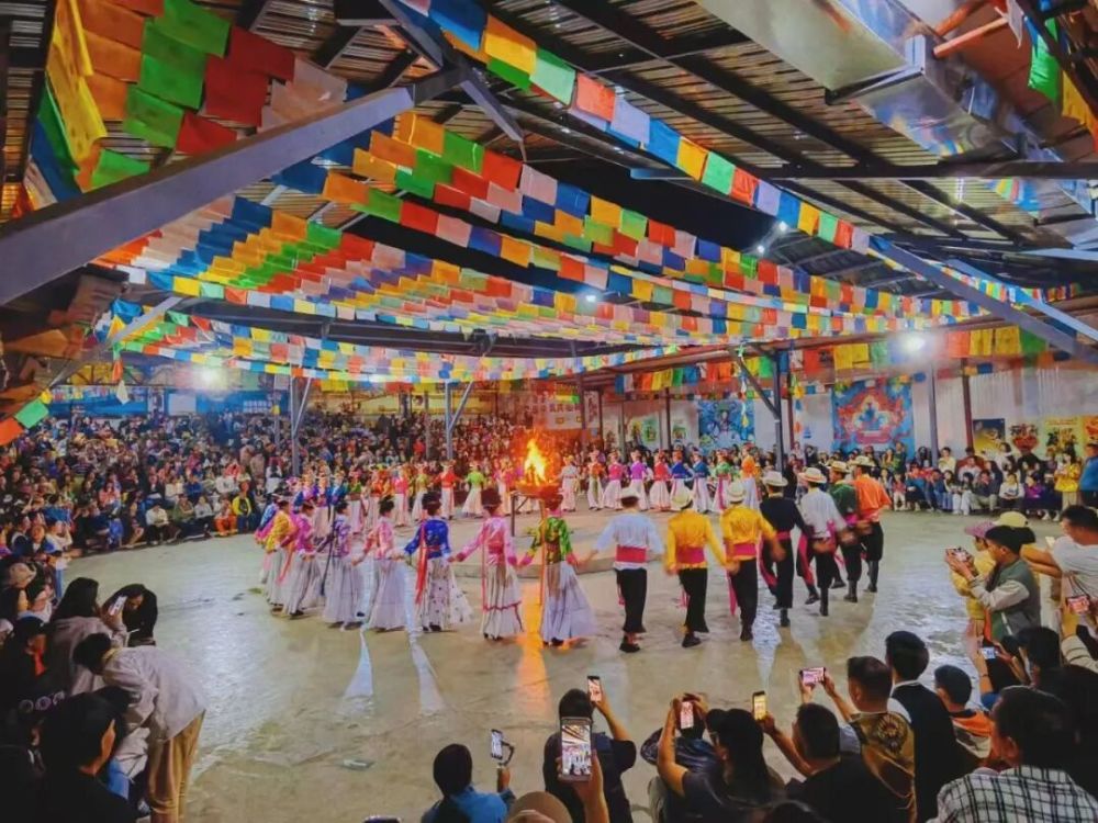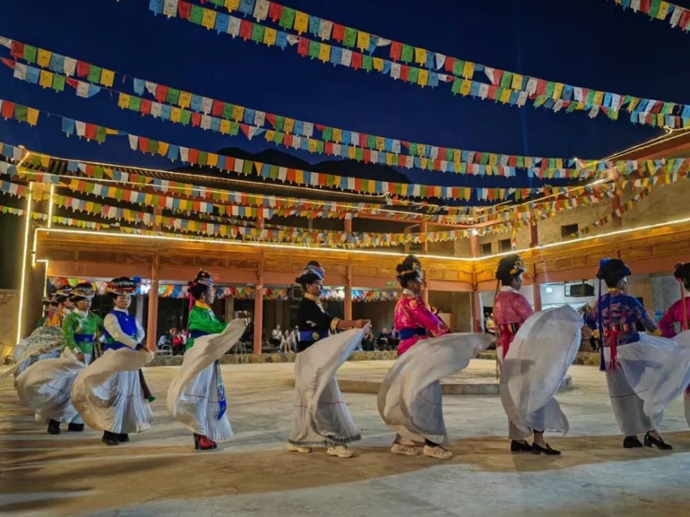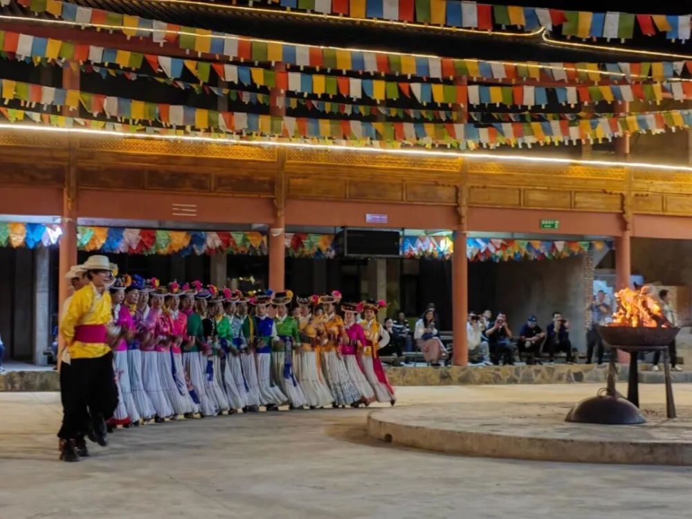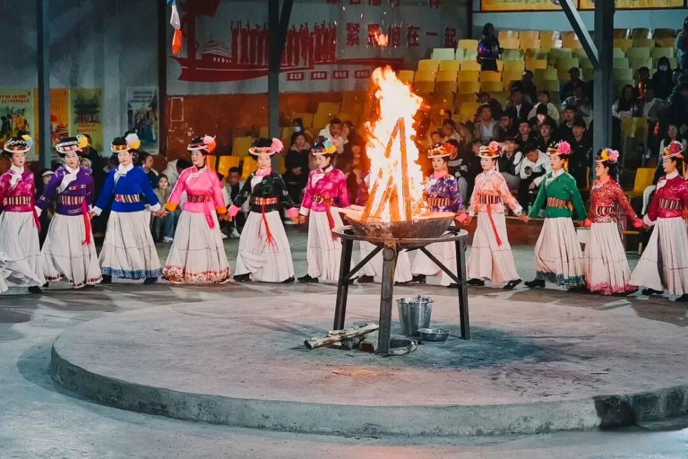 摩梭儿女身着色彩艳丽的传统服饰,手拉手围成圆圈跳起甲搓舞,伴随着悠扬的笛声和欢快的踏步声,在火光中感受摩梭人热情奔放的民族特性。