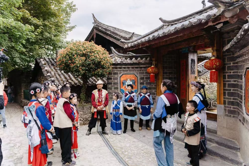 帝溢居纳西家访民俗体验馆工作人员在院门口迎接身穿民族服饰的小游客。(供图)
