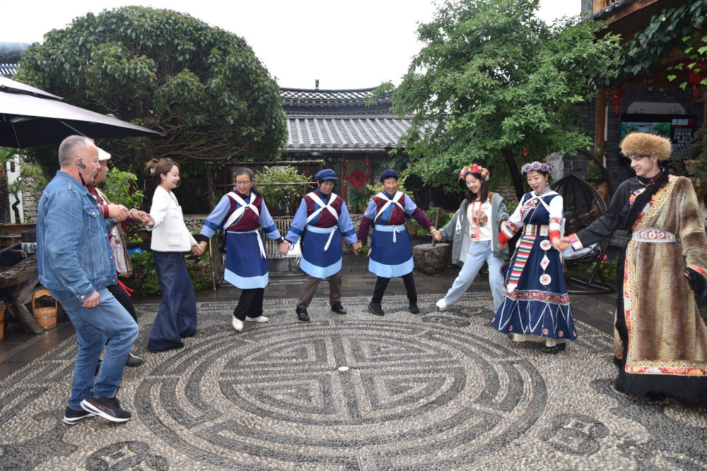 和玉月(图右二)和游客在帝溢居纳西家访民俗体验馆院中打跳。(丽江融媒记者 段玉菊 摄)