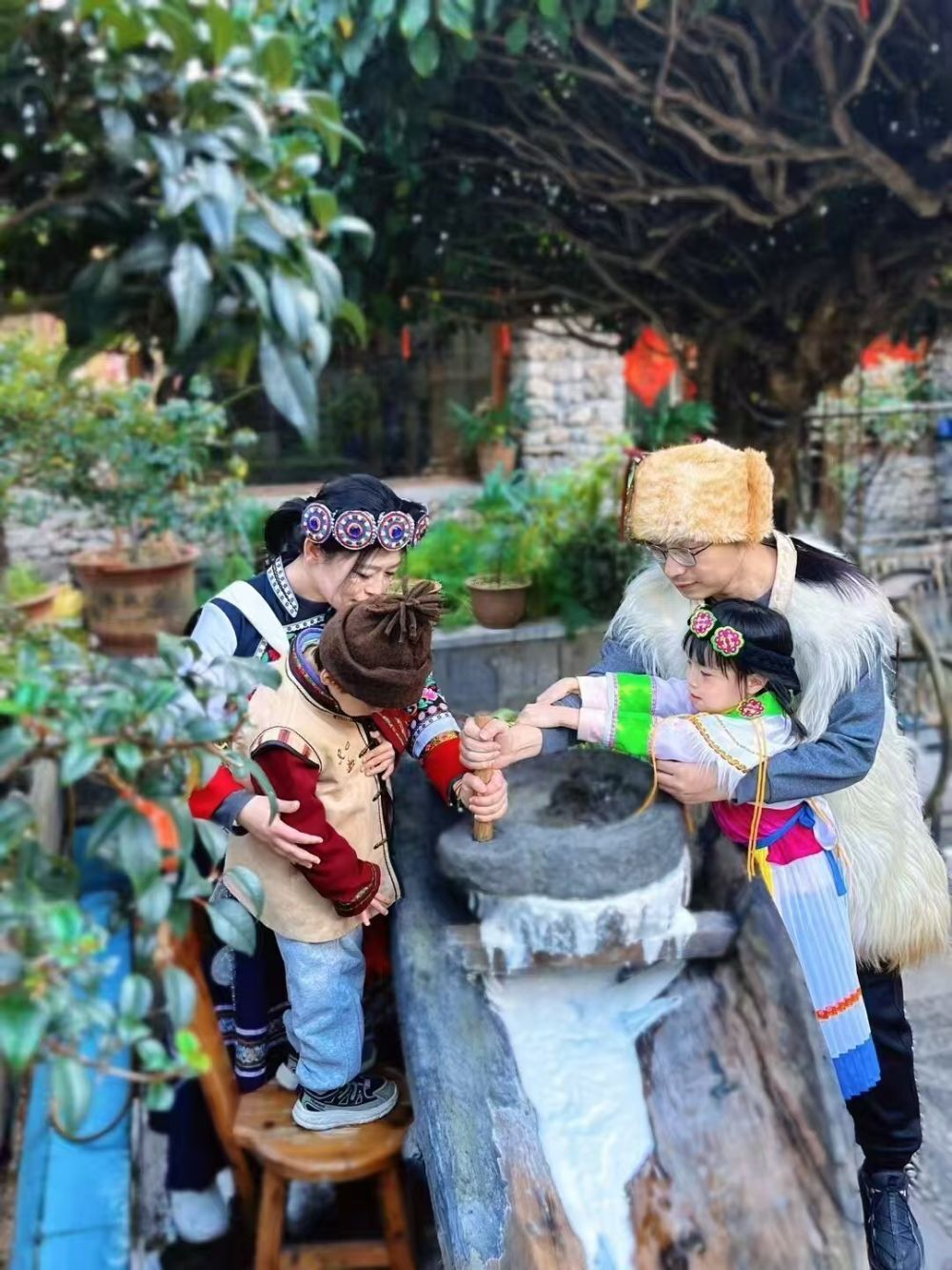 “配合腰劲,磨起来省力,豆浆也更细腻。”帝溢居纳西家访民俗体验馆主理人和玉月站在一旁,笑着指导游客磨豆浆。这座由纳西老宅改造的民俗体验馆,没有华丽装饰,却让每位到访者与鲜活的纳西文化撞了个满怀。