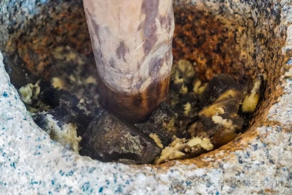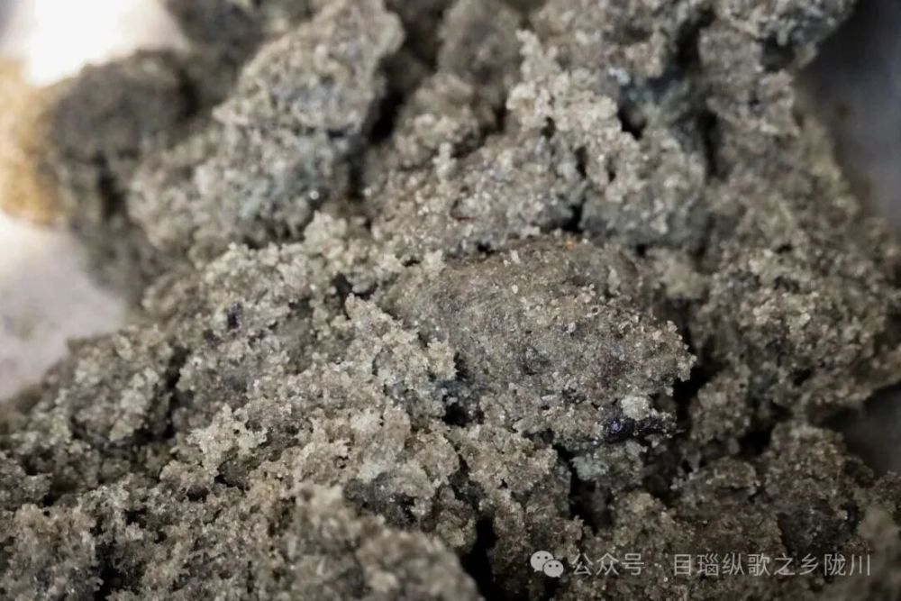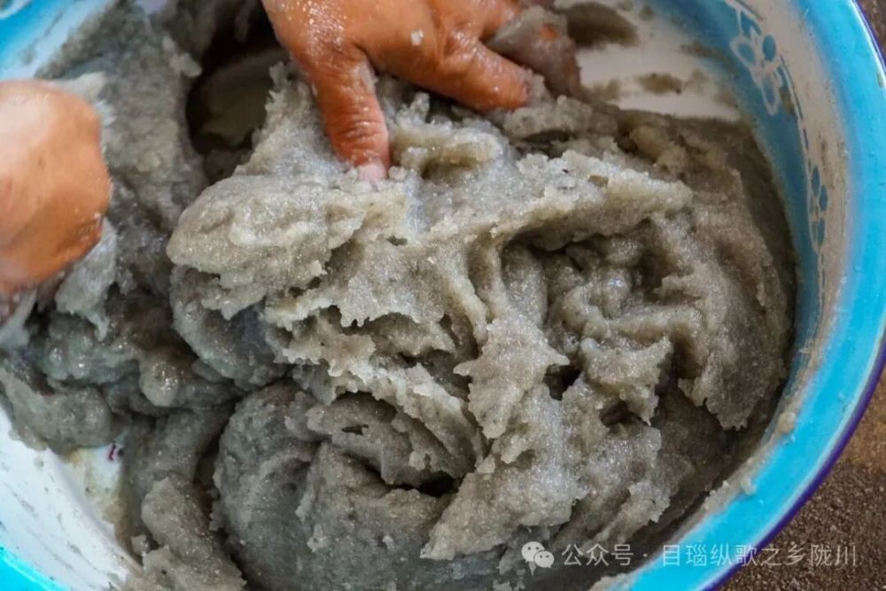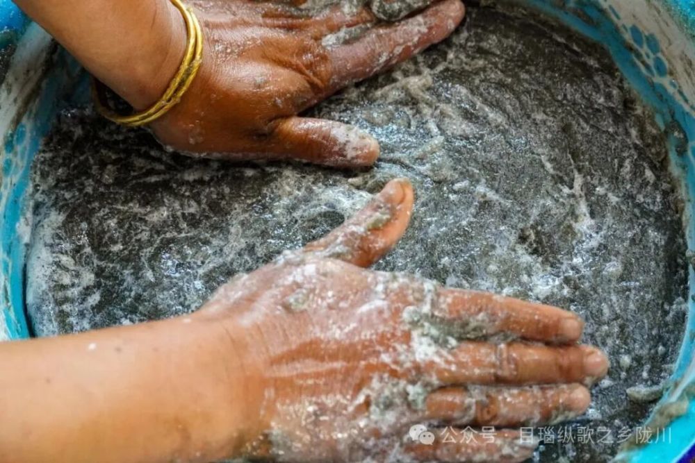 等到魔芋舂成灰色的细砂状,就可以开始揉搓了,加入适量温水,不停揉搓,直至魔芋逐渐膨胀变得浓稠,这时就可以加入石灰水或草木灰,让魔芋凝固定型。