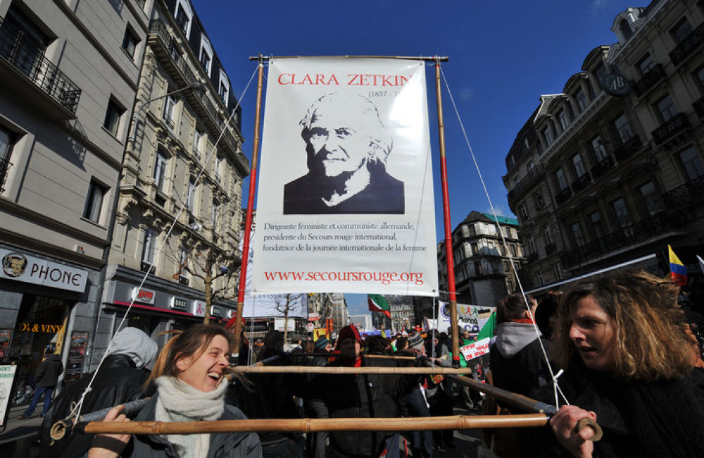 2010年3月6日,在比利时首都布鲁塞尔,妇女代表抬着著名女政治活动家、三八国际妇女节的倡导者克拉拉·蔡特金的画像参加庆祝三八国际劳动妇女节游行。新华社记者 武巍 摄