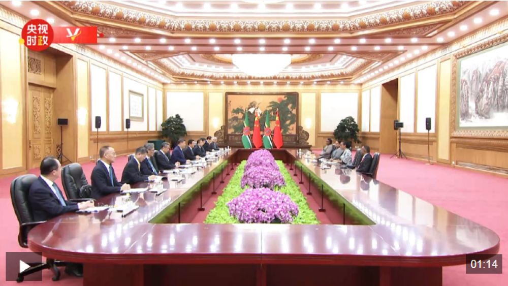 习近平指出,多米尼克是中国在加勒比地区的好朋友、好伙伴。建交20多年来,两国始终相互尊重、平等相待,政治互信不断巩固,各领域交流合作蓬勃开展,人民友谊日益深厚,树立了不同社会制度、不同大小国家间友好合作的典范。
