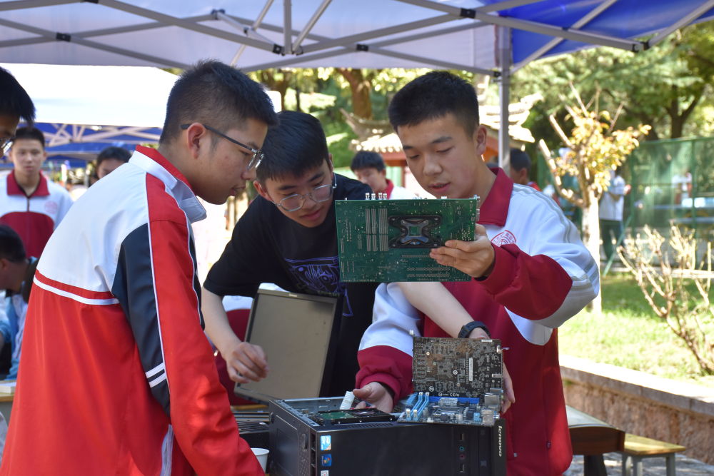 社团展示区里,当代一中学子的青春风采令人瞩目,信息社社员单靖正向校友介绍社团日常:“社团教同学们组装电脑,在动手实践中学习信息知识。”
